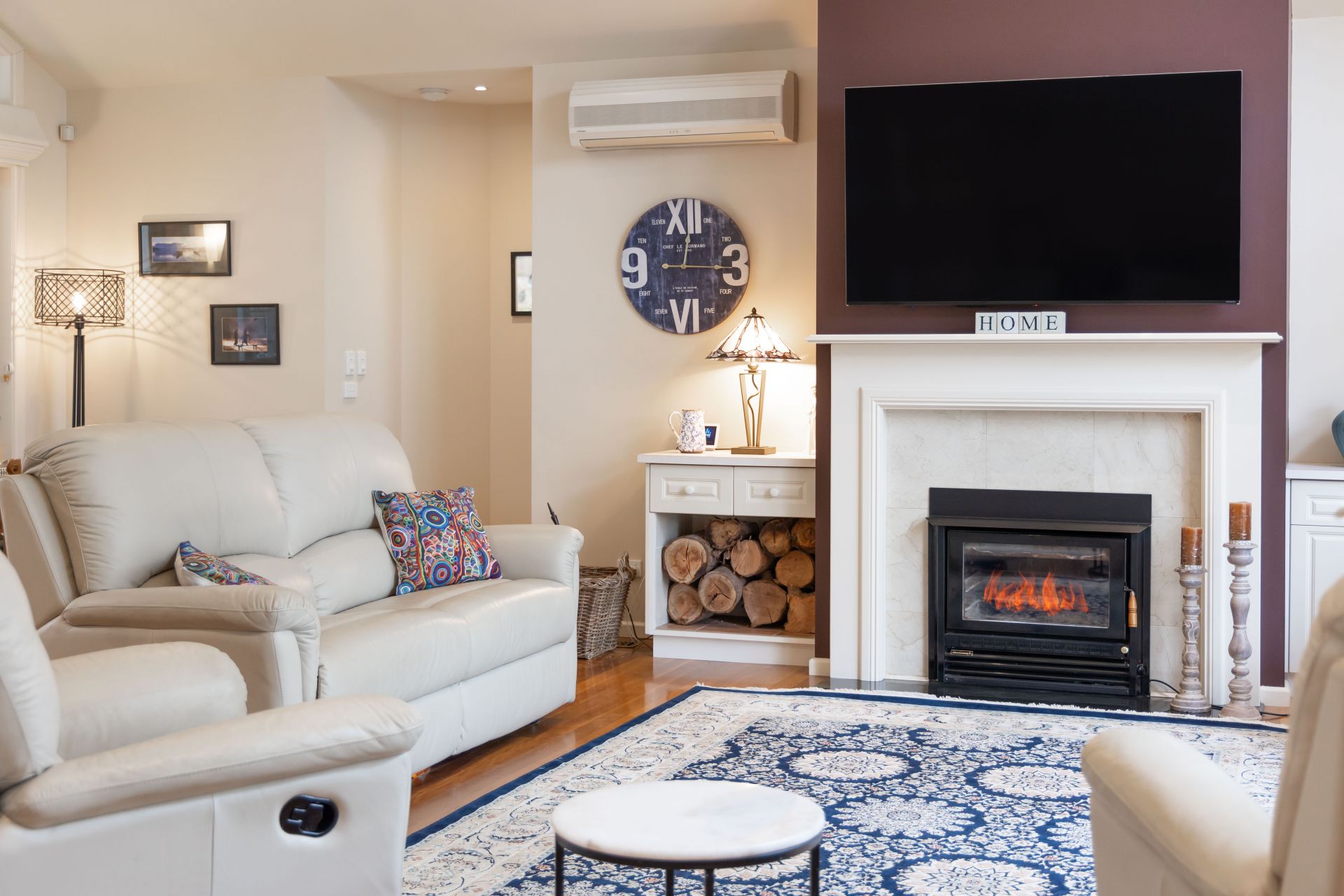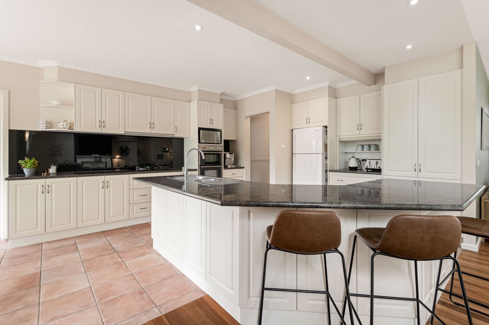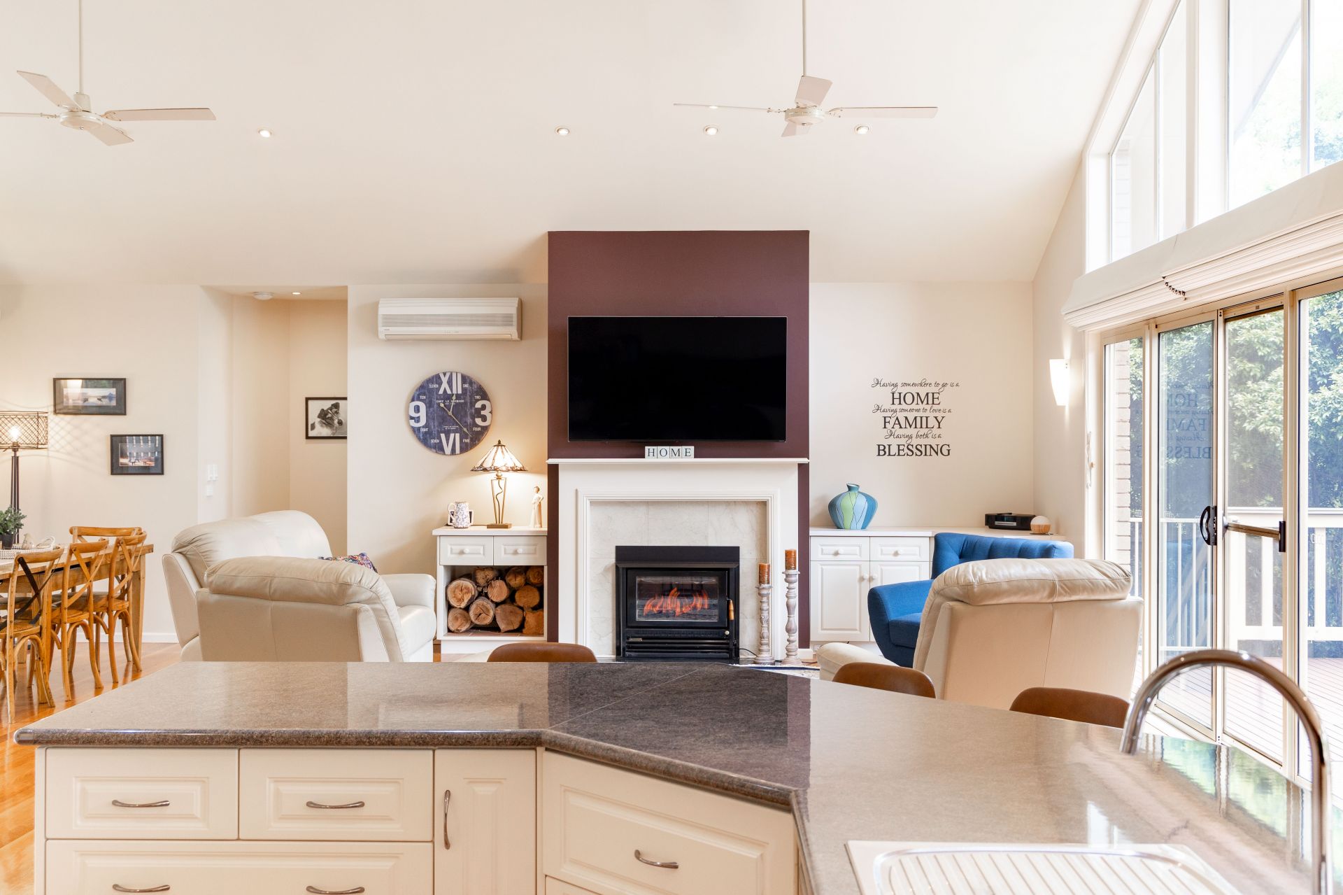 The living spaces are designed to impress, with two distinct zones that cater to both relaxation and entertaining. A formal lounge with a picturesque window offers serene views, while the heart of the home is the designer hostess kitchen. Boasting premium finishes, it seamlessly connects to the open-plan living area, accentuated by soaring vaulted ceilings and an abundance of natural light. Cooler evenings are spent around the cosy log fire, while there is the convenience of gas ducted heating, split system heating & cooling plus the added bonus of a 7.5KW solar system will help to ensure cheaper electricity bills.