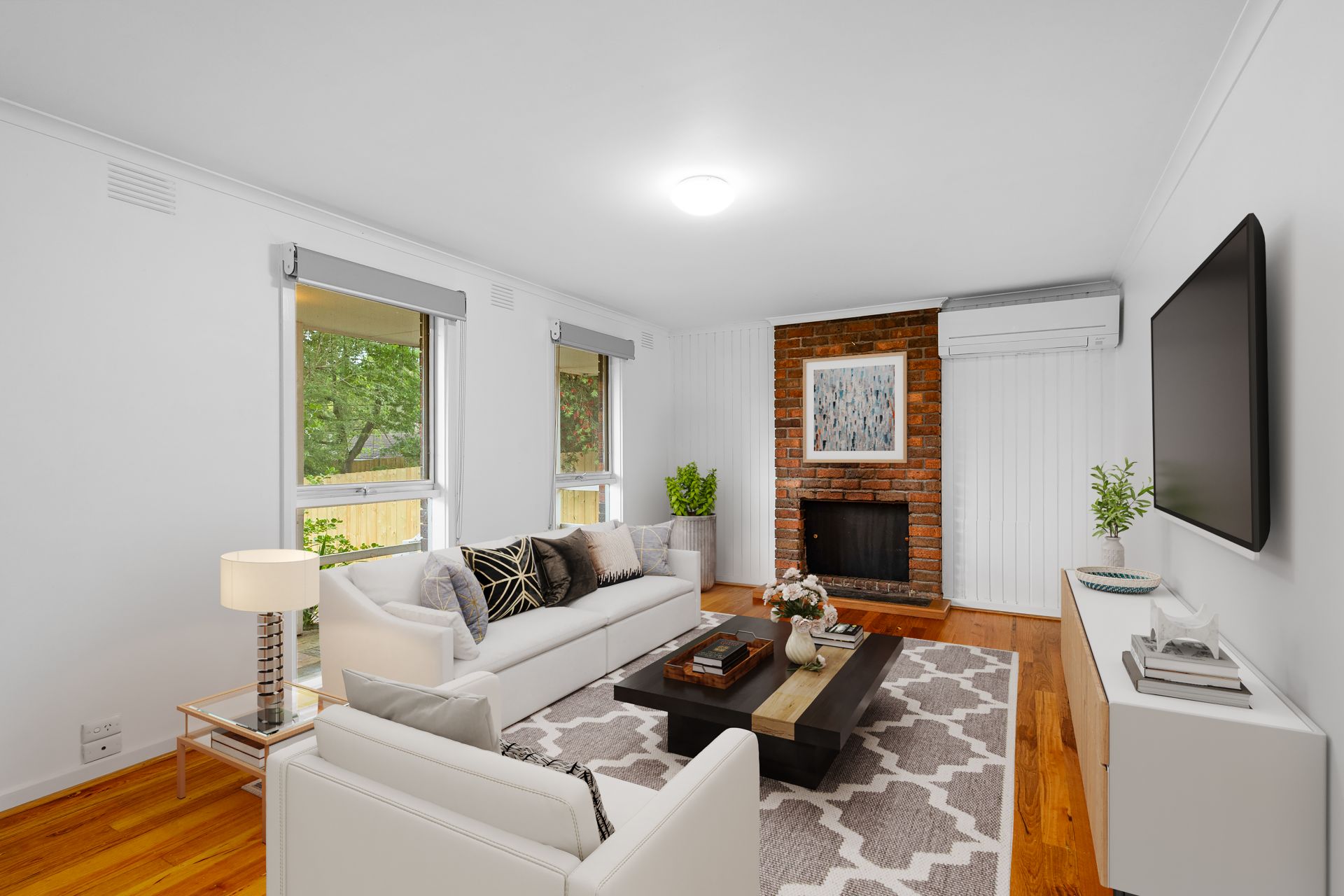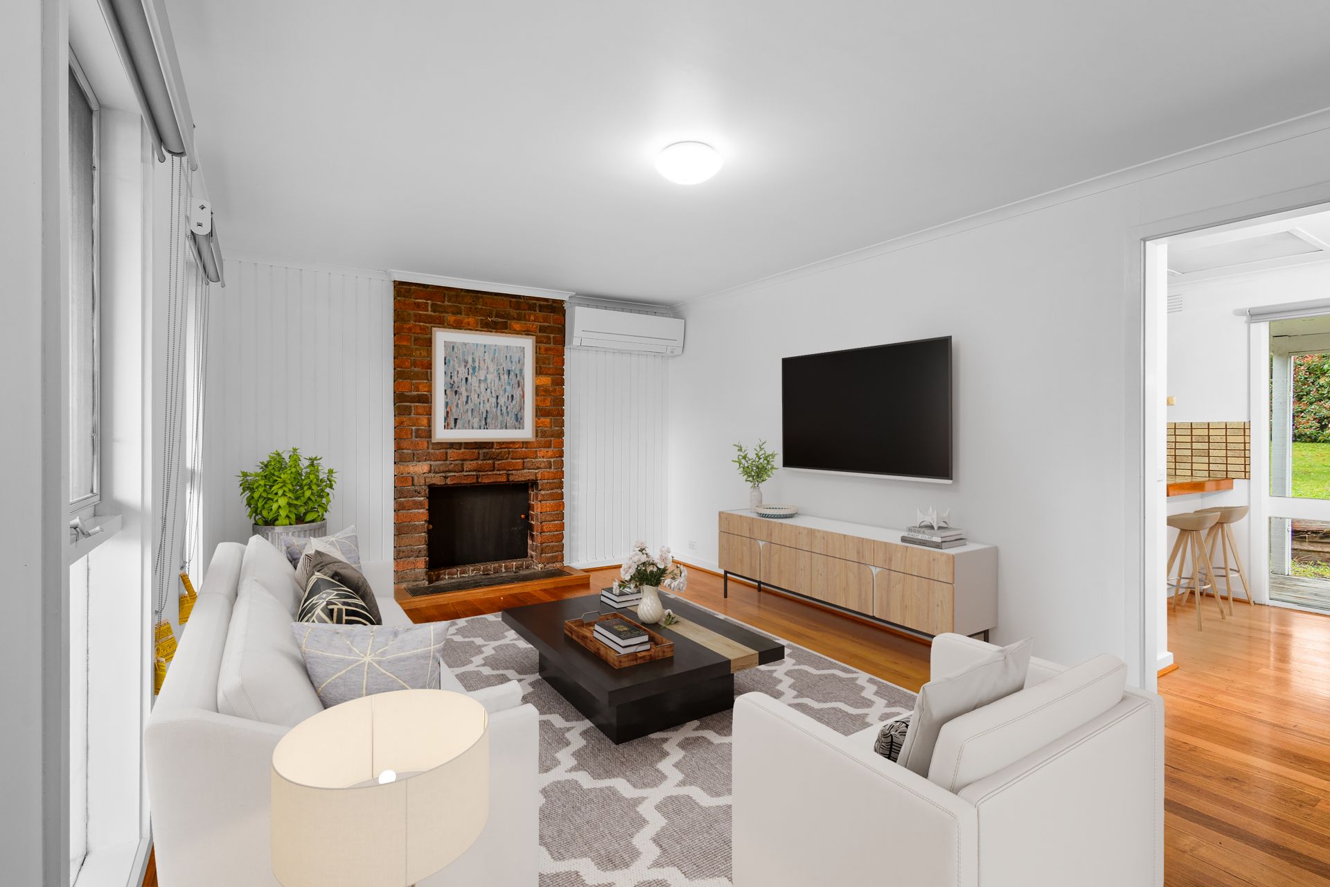 Offering three large bedrooms, including a generous primary bedroom with a triple built-in robe, the layout is practical and family-friendly. The central family bathroom includes a separate toilet for added convenience. The cosy open fireplace creates an ideal spot to unwind, while the split system heating and cooling ensures year-round comfort.