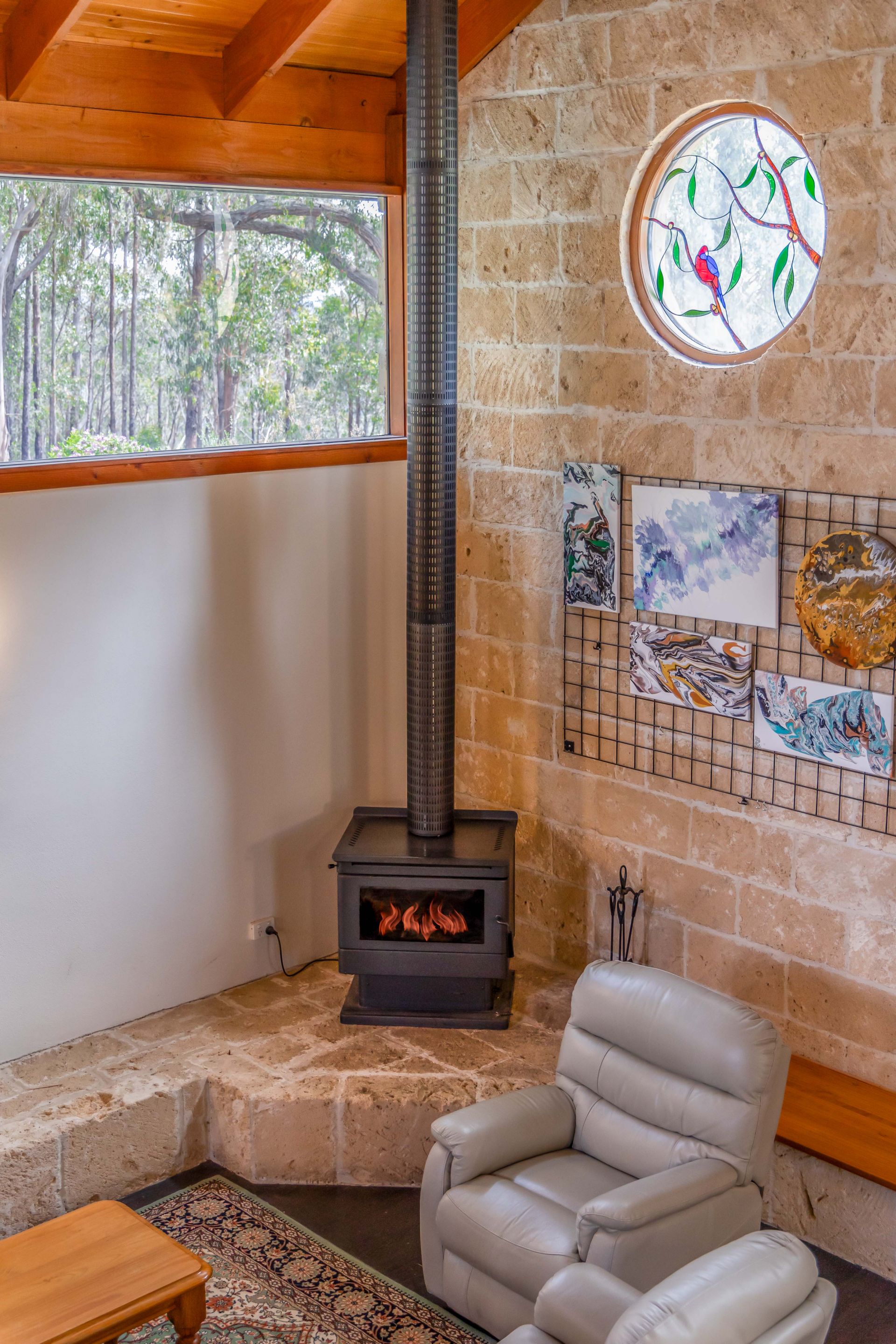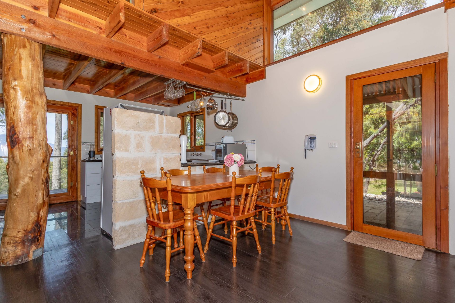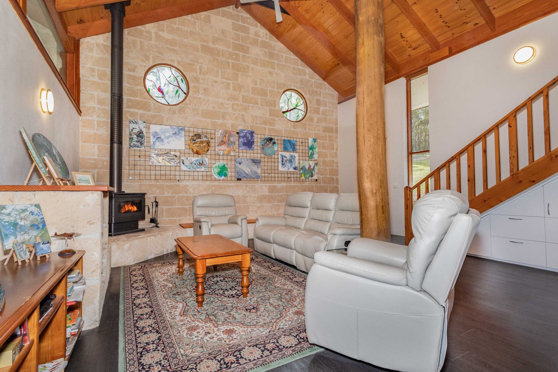 Crafted from exquisite sandstone, the retreat's grand entrance reveals a towering cathedral ceiling, natural light through clerestory and leadlight windows, and striking timber poles that add a warm, rustic charm to the open-plan living and kitchen area.