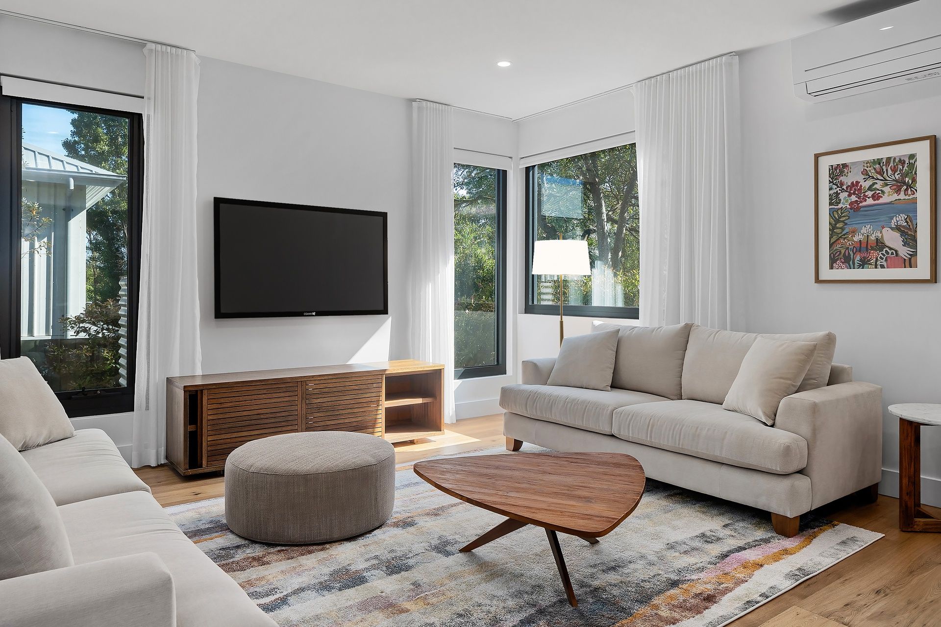 Designed with both aesthetics and functionality in mind, this home includes premium features such as engineered Oak flooring, an HRV heating recovery ventilation system for energy efficiency, and multiple split-system air conditioning units throughout. The beautifully landscaped gardens, fully fenced for privacy, and a rainwater tank further enhance the home's sustainable and luxurious lifestyle offerings.